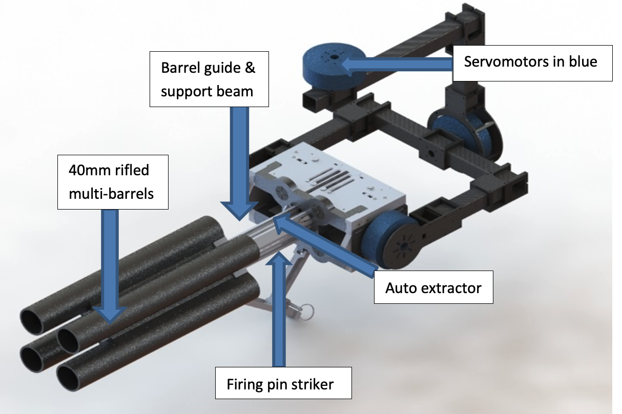 The Quad-40 RWS combines (4) 40mm tubes mounted on a remotely controlled, tactical gimbal for lethal or less than lethal deployment when fired remotely from air, land, or sea platforms, day or night, or in any weather conditions. The Quad-40 is designed to accessorize drones, robots, vehicles, aircraft, tripods, or sea-based platforms via a quick-attach plate (Picatinny/Arca rails) for rapid deployment/recovery. Fires any/all tubes individually or simultaneously and has a cUAS capability.